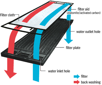 Its structural feature is to place filter cloth and filter aid membrane between horizontally stacked filter plates and penetrate water. Filtering and back flushing is performed in single direction so that the filter aid homogeneously laminated enhances efficiency of filter and allows rapid action against fast contamination.